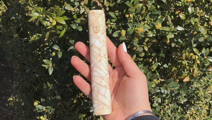 Golden spider twisted marble mezuzah case with the Hebrew letter shin delicately engraved and painted in gold on the front for a modern touch. The mezuzah is an ancient Jewish tradition and a symbol of faith and protection. Mounted on doorposts, mezuzah cases hold a handwritten parchment scroll inscribed with the Hebrew words of the Shema prayer. This stunning custom made mezuzah case is made of glowing golden spider marble. Let the warmth and beauty of sunlight light your space. Waterproof, suited to indoor or outdoor use. Comes with 3M double stick tape for easy hanging. Scroll not included.